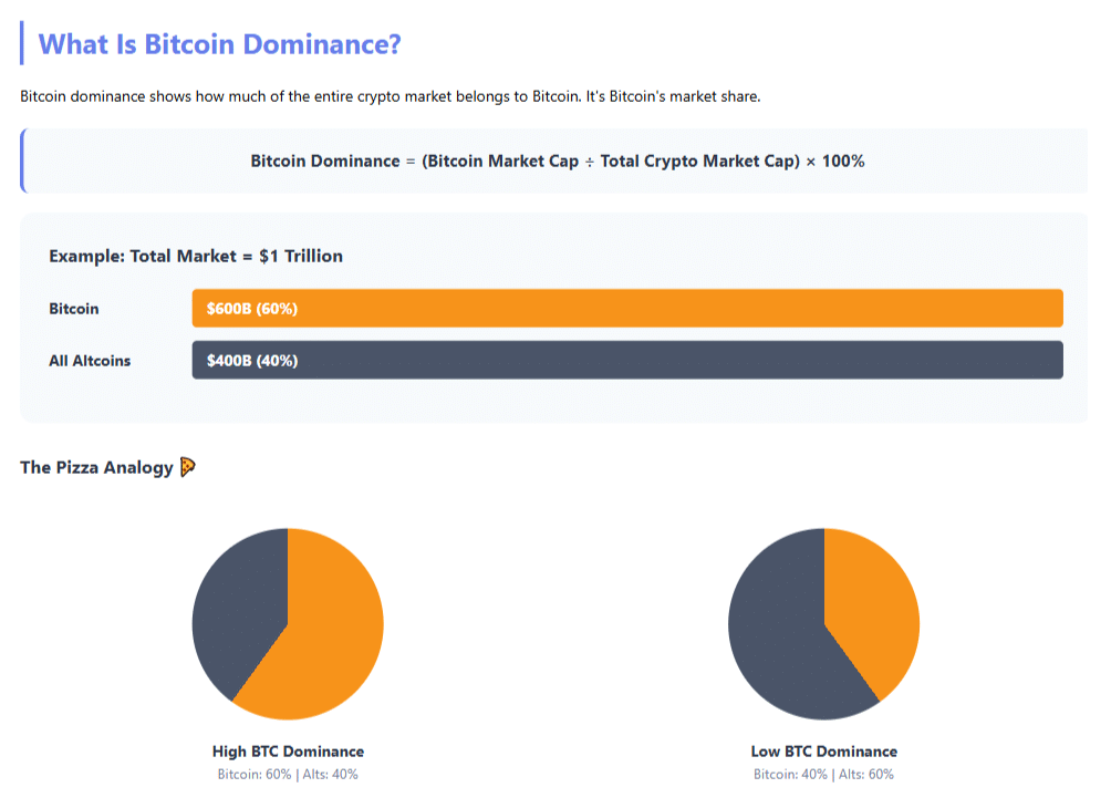 Bitcoin dominance is a metric that shows how much of the entire crypto market belongs to Bitcoin. In simple terms, it’s Bitcoin’s market share.