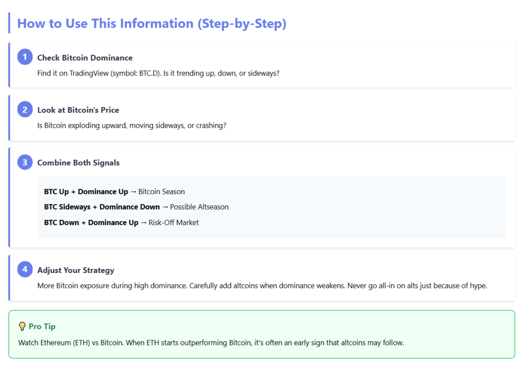 Buying altcoins just because Bitcoin dominance dropped slightly. Small dips don’t mean altseason. Sustained trends matter more than one-day moves.