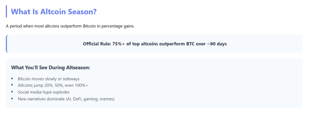 - If 75% or more of top altcoins outperform Bitcoin over ~90 days, the market is in altcoin season