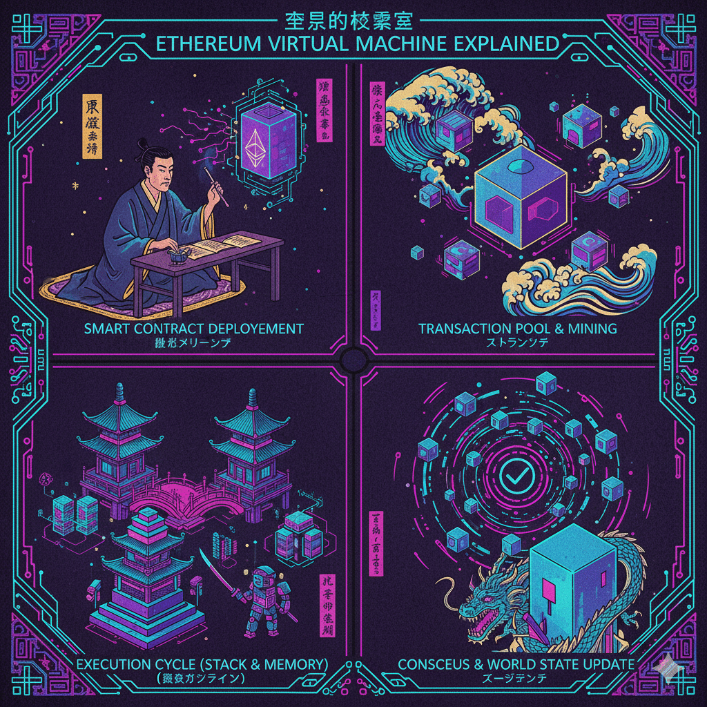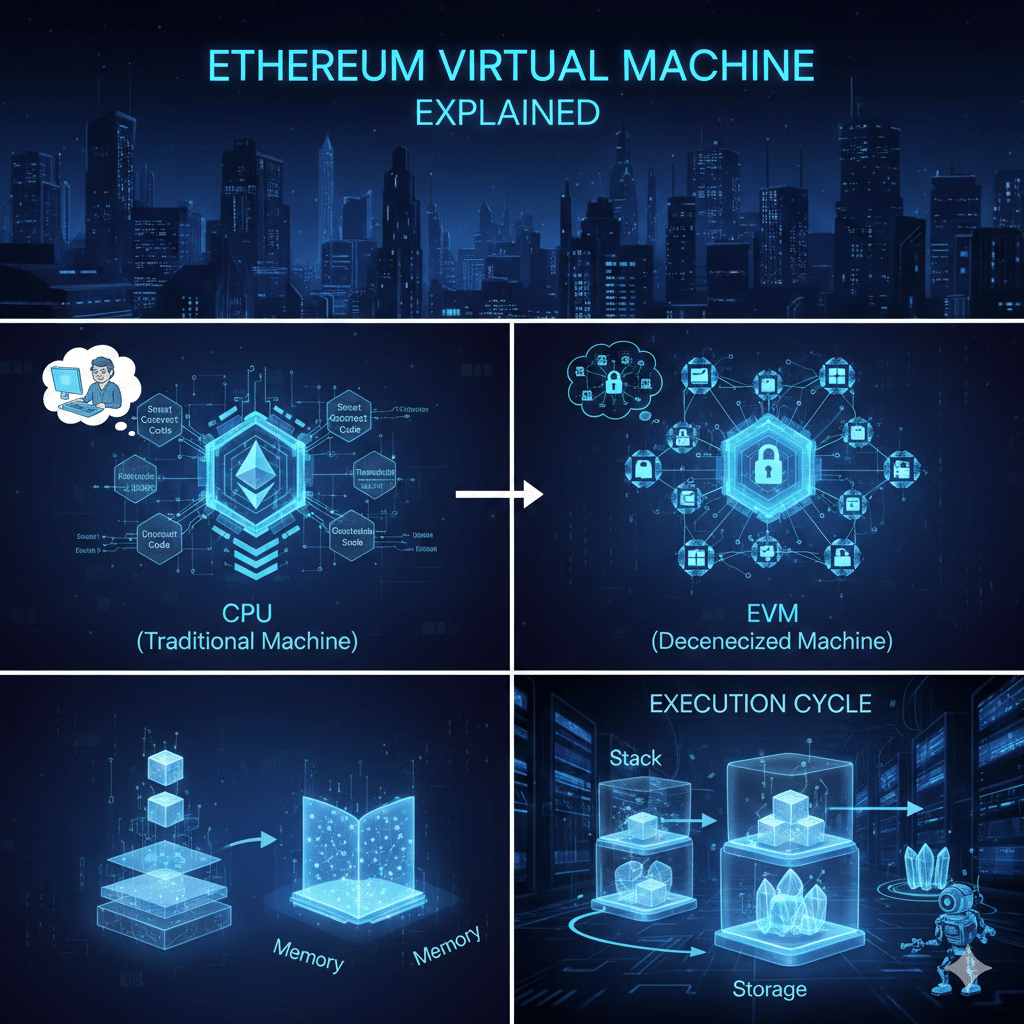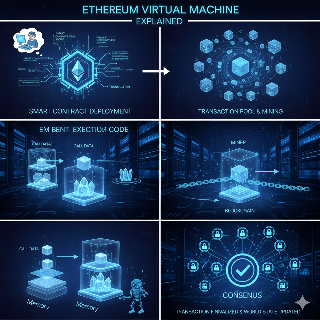 Ethereum Virtual Machine (EVM) definition is as the following: a computation technology that works as a non-centralized computer. There are many applications that may be run by EVM. It serves as the virtual machine that underpins Ethereum's complete operating system. It is a portion of Ethereum that handles smart contract execution and deployment. The EVM's function is to aggregate a few new elements to the Blockchain. By doing that, consumers have minor obstacles with the distributed ledger.
