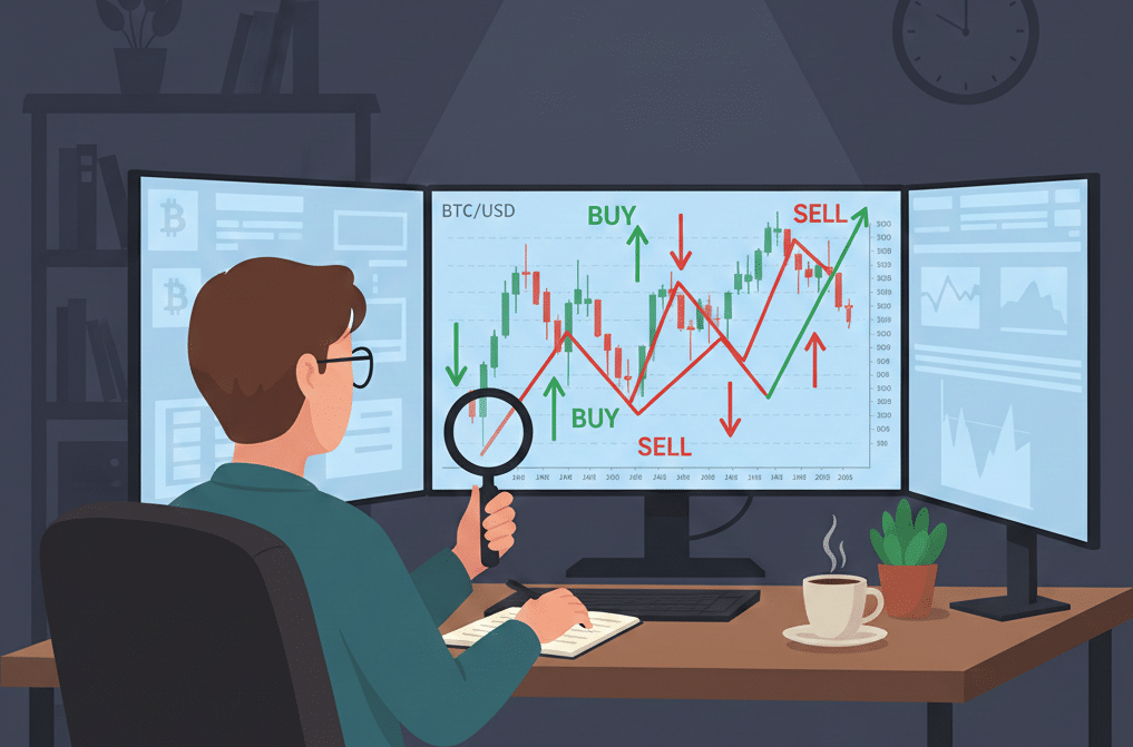 Let's say you have a strategy: "Buy Bitcoin when the price drops 10% in one week, and sell when it rises 5% from your entry." Backtesting means going back through historical Bitcoin charts and checking: If I had followed this rule over the past year, would I have made money or lost money?